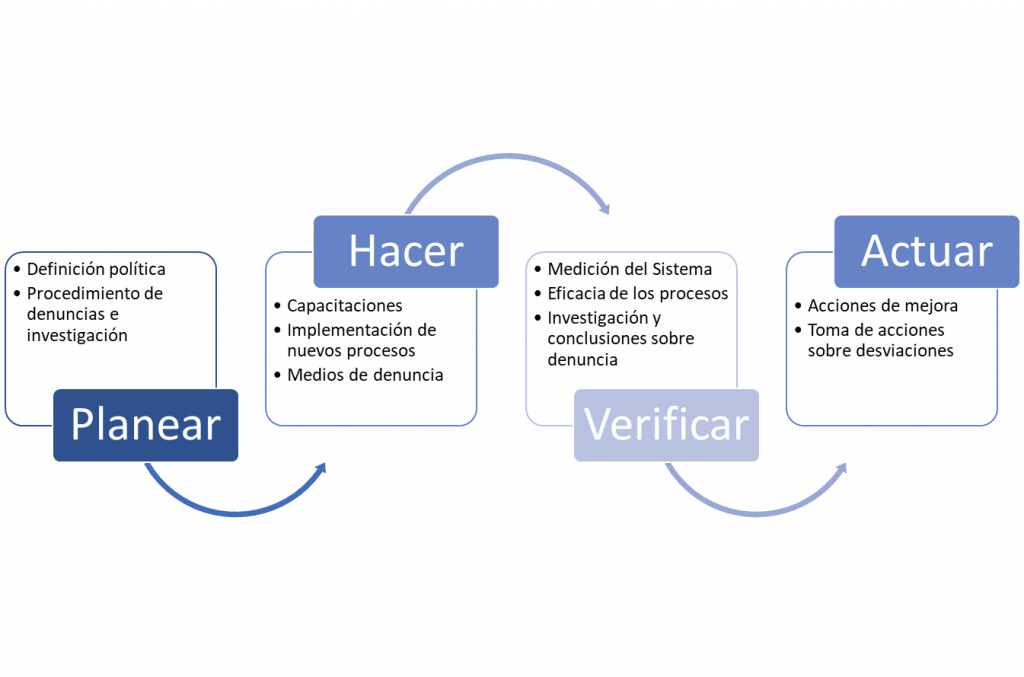 El ciclo PHVA tiene 4 fases: Planear, Hacer, Verificar y Actuar. Cada una de ella tiene acciones específicas que se muestran en el cuadro a continuación: