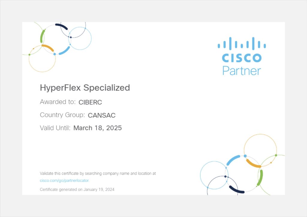 La calificación para la Especialización en Cisco HyperFlex está programada para renovarse el 18 de marzo de 2025. La Especialización en Cisco HyperFlex fortalece aún más la posición de CIBERC como líder en soluciones de tecnología avanzada en la región de CANSA y continúa demostrando su capacidad para ofrecer innovación y experiencia técnica de primer nivel a sus clientes, consolidando su reputación como un socio estratégico confiable en el campo de la tecnología.