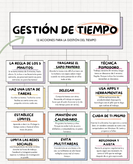 Entendiendo su importancia, aquí les compartimos 12 acciones para una buena gestión del tiempo. Y recuerda que solo tu puedes aprovechar esas 24 horas que te da la vida cada día, son puro oro en polvo.