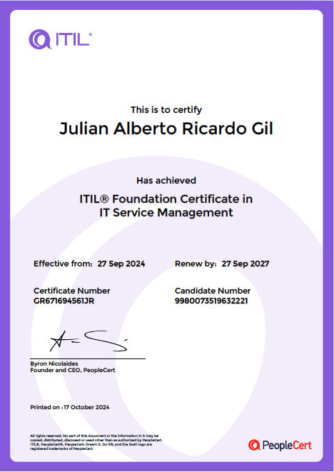 Julián Ricardo ha alcanzado una importante meta profesional al obtener la Certificación ITIL, una de las más reconocidas en el ámbito global para la gestión de servicios de TI. Este logro refleja su dominio de un enfoque estructurado, basado en las mejores prácticas, que busca alinear los servicios tecnológicos con las necesidades empresariales.
