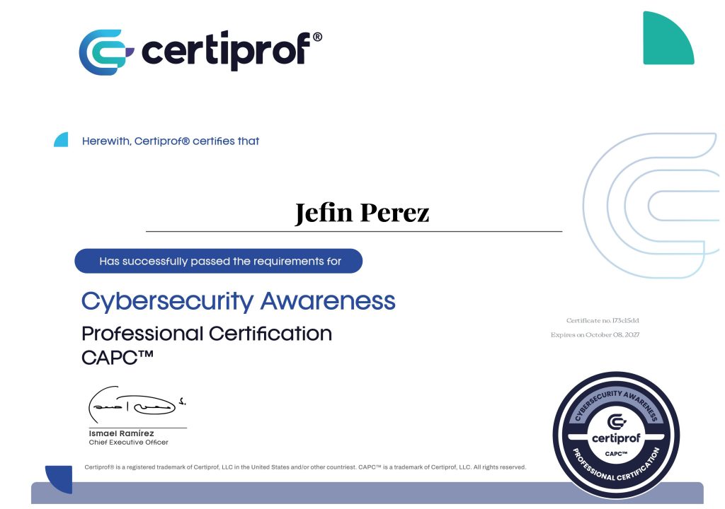 Jefin Pérez obtiene certificación en Cybersecurity Awareness, Esta es una certificación que proporciona los conceptos generales de las amenazas, riesgos y buenas prácticas para mantenernos mucho más seguros, permitiéndonos minimizar el alcance de los ataques cibernéticos, haciéndonos más resilientes y productivos en el mundo digital.